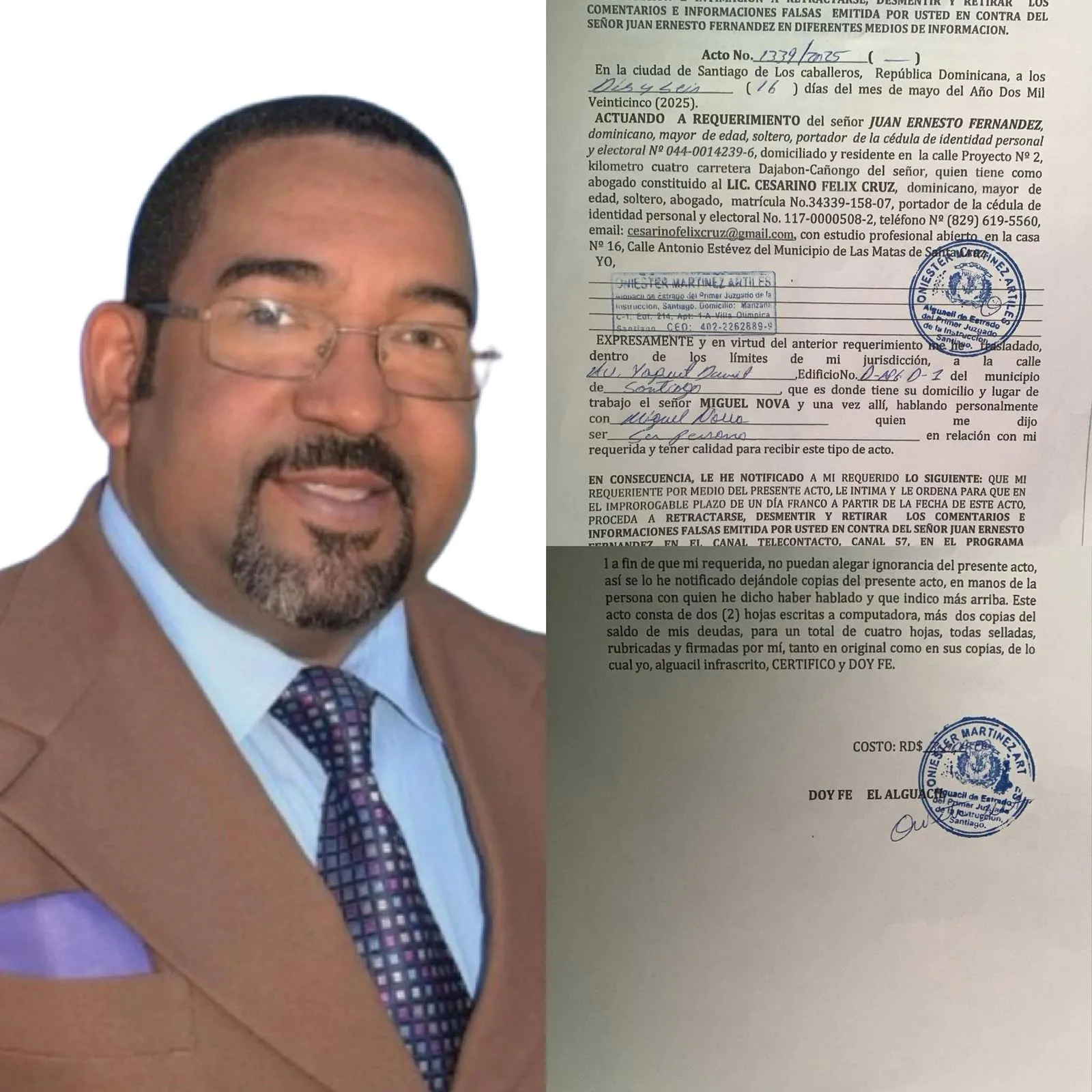 La notificación, entregada este 16 de mayo en Santiago de los Caballeros, establece un plazo legal de un día hábil para que el requerido se retracte, desmienta y retire públicamente las declaraciones, las cuales fueron divulgadas en el programa “Agroambiente”, que se transmite por Canal 57, Telecontacto, así como en otros espacios informativos.