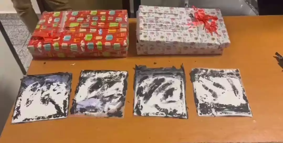 Agentes de la Dirección Nacional de Control de Drogas (DNCD) y miembros del Cuerpo Especializado de Seguridad Aeroportuaria, coordinados por el Ministerio Público, ocuparon cuatro láminas de cocaína, camufladas en cajas envueltas en papel de regalos, durante un operativo de inspección realizado en el Aeropuerto Internacional de las Américas, JFPG.