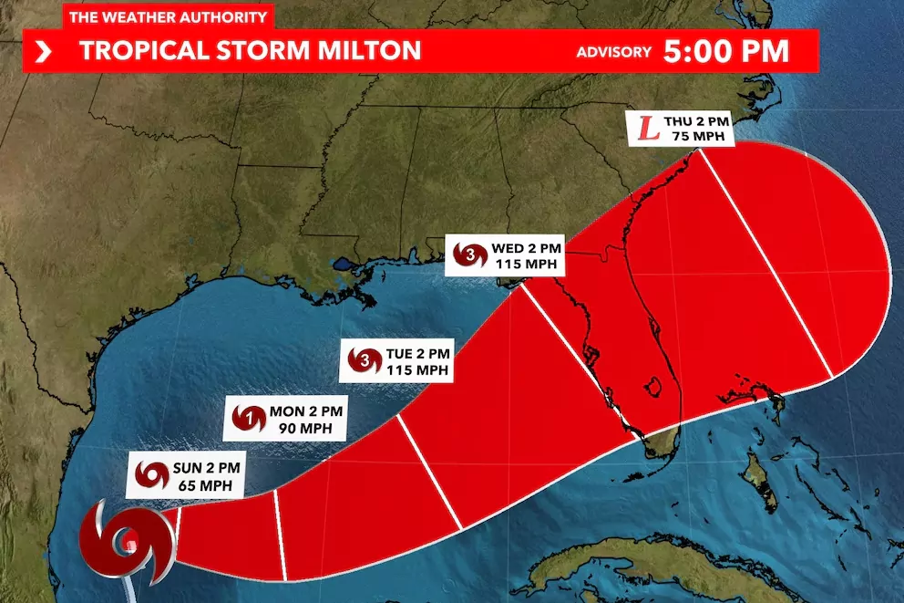 Milton, que se formó en el Golfo de México, tiene el potencial de intensificarse rápidamente y podría convertirse en huracán durante las primeras horas del lunes. Se prevé que la tormenta toque tierra en la costa oeste de Florida la próxima semana, con riesgos significativos de marejadas ciclónicas y vientos fuertes a partir del martes y miércoles.