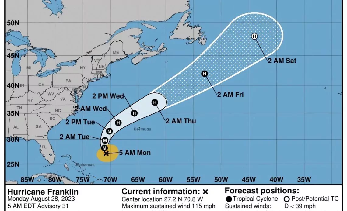 Franklin, que la semana pasada tocó tierra como tormenta tropical en el sur de República Dominicana, donde descargó lluvias intensas que provocaron inundaciones y desbordamientos, estaba esta mañana a 395 millas (635 km) al norte de la isla Gran Turca (Turcas y Caicos) y a 505 millas (810 km) al suroeste de Bermuda.