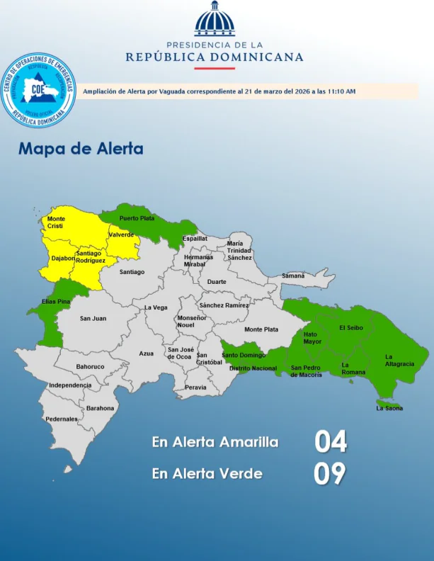 El COE mantiene 04 provincias en alerta amarilla y aumenta 08 y el Distrito Nacional en verde, debido a que el informe del INDOMET establece que las condiciones meteorológicas están bajo la incidencia de un sistema frontal ubicado al noroeste del país y su vaguada asociada, los cuales han estado generando desde tempranas horas matutinas aguaceros moderados a fuertes en ocasiones, acompañados de posibles tormentas eléctricas y ráfagas de viento.