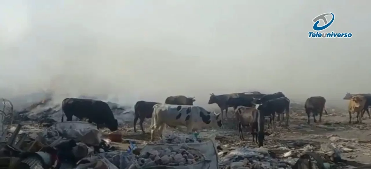 Al igual que el vertedero que comparten los distritos municipales de Hato del Yaque y La Canela, el espacio sirve para la crianza de vacas que pululan en medio del intenso humo.