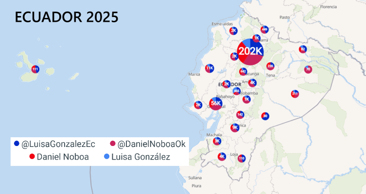El mapa digital muestra una división clara. Pichincha y Guayas concentran el 60% de las interacciones, consolidándose como los epicentros de las campañas. Daniel Noboa lidera con un alcance potencial de 1.4 millones, seguido de cerca por Luisa González. Sin embargo, el sentimiento negativo asociado a ambos candidatos no pasa desapercibido: Noboa enfrenta un 40.2% de negatividad, mientras que González alcanza un 37.3%.