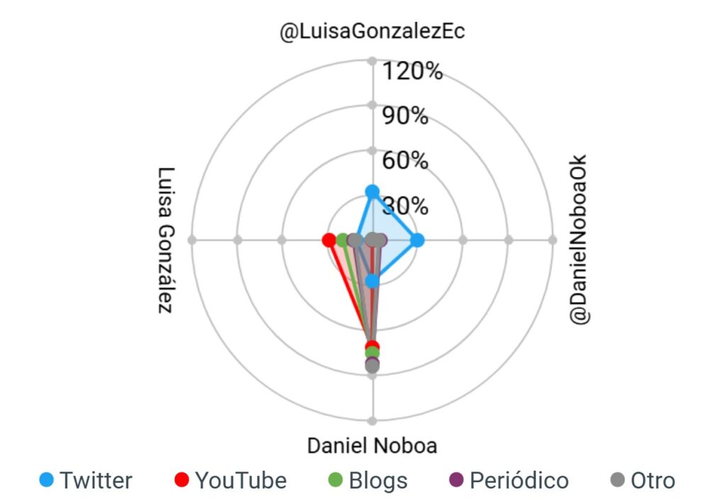 Un análisis de los medios de comunicación revela que Twitter lidera con el 96.8K de menciones para Luisa González y 89.6K para Daniel Noboa. Sin embargo, plataformas como YouTube, blogs y periódicos también tienen un rol significativo, con Noboa alcanzando 717 menciones en YouTube frente a las 287 de González. Además, influenciadores clave como Andrés Arauz generan un impacto notable, con un alcance de 1.8 millones y 184.4K de engagement. Este panorama indica que las campañas deben diversificar su presencia y aprovechar a los influenciadores para amplificar su narrativa.