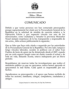 “Del señor Ivan Paulino de Jesús me he distanciado desde el 2007, cuando por un corto espacio fungió como mi chofer cuando el actual y de toda mi vida, Eduardo Acosta, estuvo indispuesto por un breve período”, manifestó mediante un comunicado en su cuenta de Twitter.