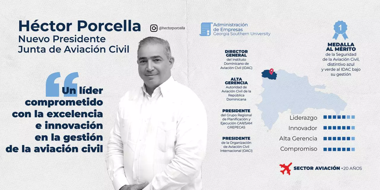 H´ctor Porcella ejerció las funciones de alta gerencia y coordinación de las responsabilidades misionales de la Autoridad de Aviación Civil de la República Dominicana. Graduado en Administración de Empresas por la Georgia Southern University en los Estados Unidos, desarrolló una amplia experiencia gerencial en diversas actividades empresariales, lo que consolidó su reputación como un líder eficiente y visionario.