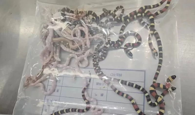 Según el comunicado, los agentes se incautaron de 104 reptiles, entre ellos serpientes de leche y serpientes del maíz, muchas de las cuales eran especies no autóctonas.