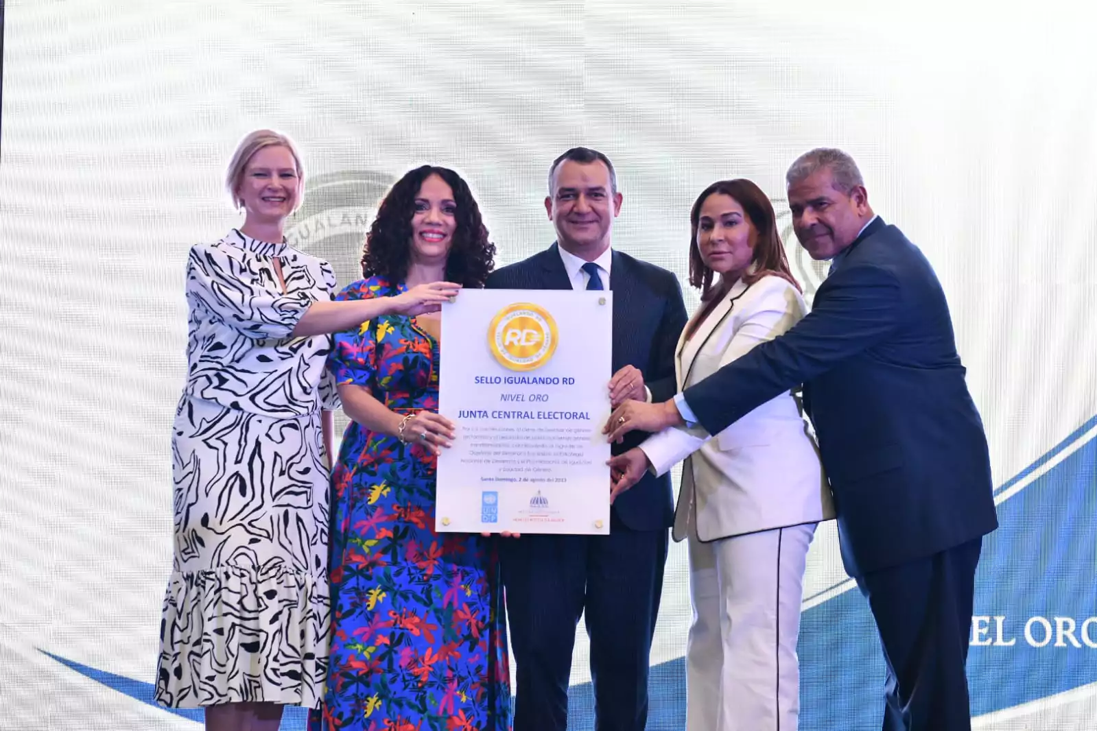 La Junta Central Electoral (JCE) recibió el galardón en la categoría oro del «Sello Igualando RD» para el sector público, por su compromiso, esfuerzo y trabajo sostenido en promover la paridad y los derechos de las mujeres de manera interna y externa en materia electoral y de identidad ciudadana.
