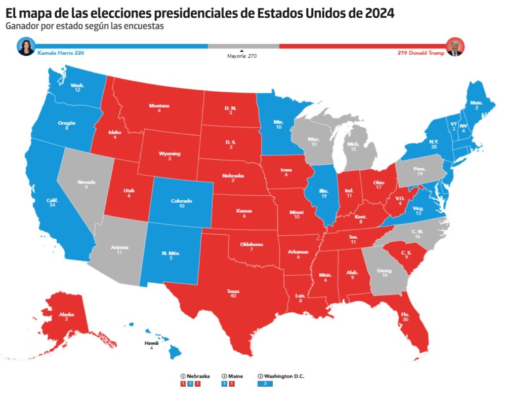 Con los datos de las encuestas y las proyecciones en redes sociales, Estados Unidos se enfrenta a una de las contiendas más reñidas de su historia reciente. La distribución de estados en el mapa electoral, donde Kamala Harris y Donald Trump están casi empatados en el número de compromisarios (226 para Harris y 219 para Trump), apunta a un desenlace que dependerá de la decisión de los votantes en siete estados clave: Nevada, Arizona, Wisconsin, Míchigan, Pensilvania, Carolina del Norte y Georgia. Estos «swing states» representan 93 compromisarios que aún no tienen dueño, y su elección final definirá quién asumirá el liderazgo de la primera potencia global.