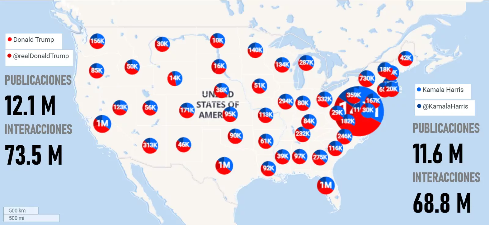 En este contexto, los esfuerzos de ambos candidatos en redes sociales para influir en la opinión pública cobran aún mayor relevancia. Trump mantiene una ligera ventaja en términos de interacciones totales y publicaciones, logrando captar la atención de un público diverso en todo el país, mientras que Harris se presenta como una figura de estabilidad, resonando con votantes de grandes áreas urbanas y cosmopolitas, particularmente en la costa oeste y la franja urbana del noreste.