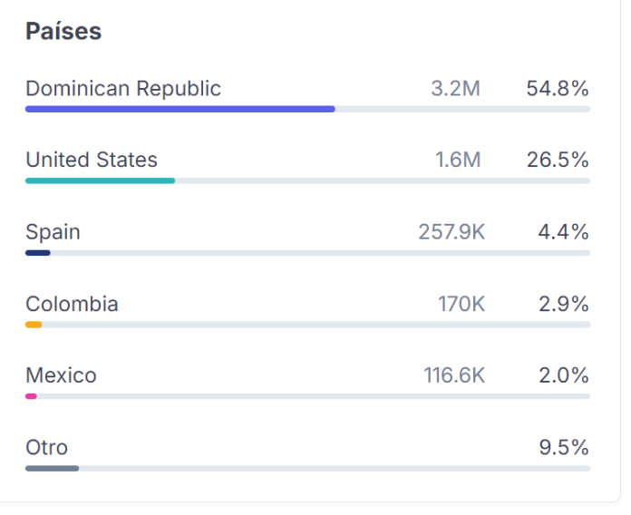 Con una audiencia que se reparte entre la República Dominicana 3.2 millones (55%), la diáspora en EE. UU. 1.6 millones (26.5%) y comunidades en España 258K, Colombia 170K y México 116K, el reality ha superado las fronteras de un programa local. Jóvenes de entre 18 y 24 años —casi la mitad de la audiencia— son los grandes protagonistas del consumo, pero lo más disruptivo es la presencia creciente de mujeres en un formato históricamente dominado por un público masculino.