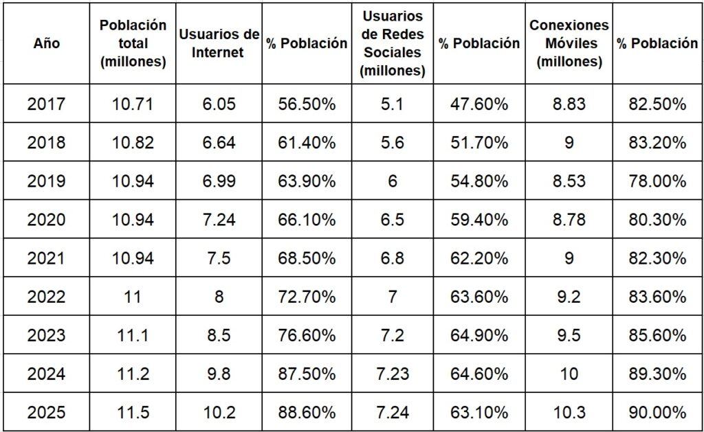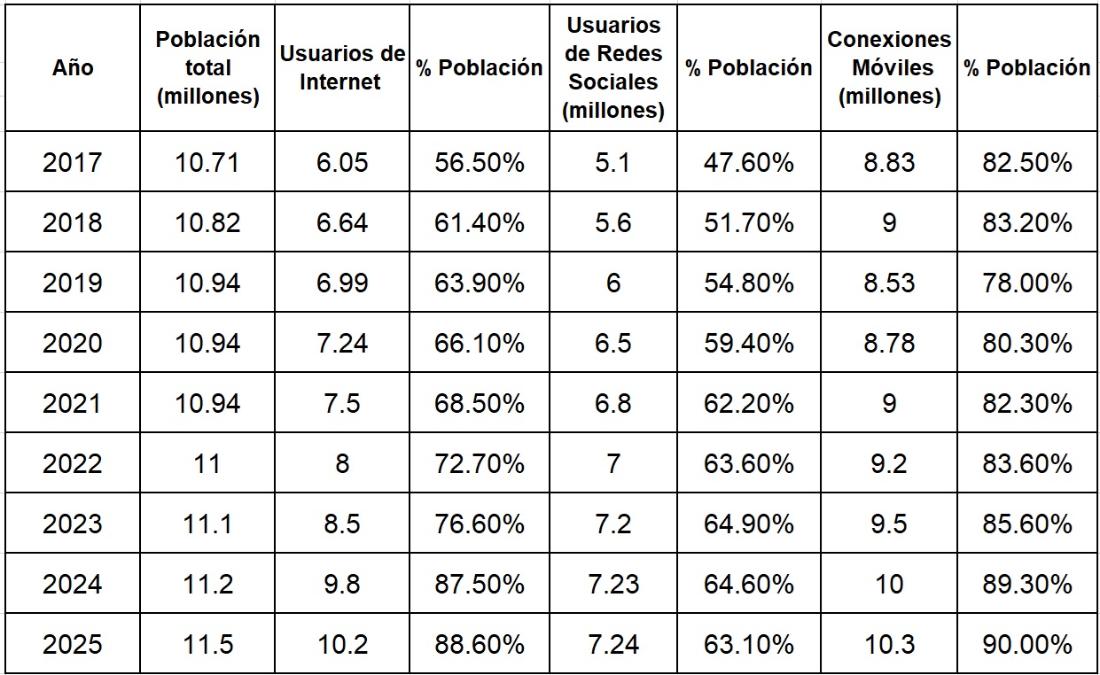 La siguiente tabla ha sido actualizada con los datos correctos extraídos de las imágenes proporcionadas, reflejando la evolución de la conectividad en la República Dominicana desde 2017 hasta 2025. Los valores intermedios de 2020 a 2024 se han ajustado según la tendencia observada, y se han eliminado las menciones de «(estimación)» para mayor claridad.