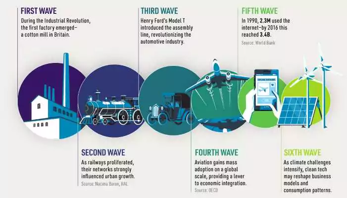 La tecnología limpia también está cobrando protagonismo en la sexta ola. Los costos de la energía solar fotovoltaica han disminuido en un 89% desde 2010, y la capacidad instalada de energía eólica ha aumentado significativamente y están emergiendo como pilares fundamentales para un futuro sostenible. Estas tecnologías están desempeñando un papel crucial en la transición hacia una economía baja en carbono y en la lucha contra el cambio climático.