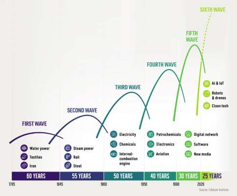 Los ciclos de innovación no solo se están volviendo más frecuentes, sino que también están siendo adoptados por la sociedad a una velocidad sin precedentes. Mientras que la primera ola duró medio siglo, las innovaciones digitales actuales se generalizan en apenas unos años.