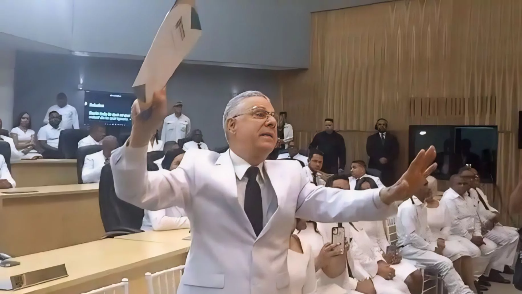 El alcalde saliente de Santo Domingo Este, Manuel Jiménez provocó un incidente en el inicio del discurso de juramentación del alcalde entrante Dío Astacio, exigiendo tiempo para leer un informe financiero.