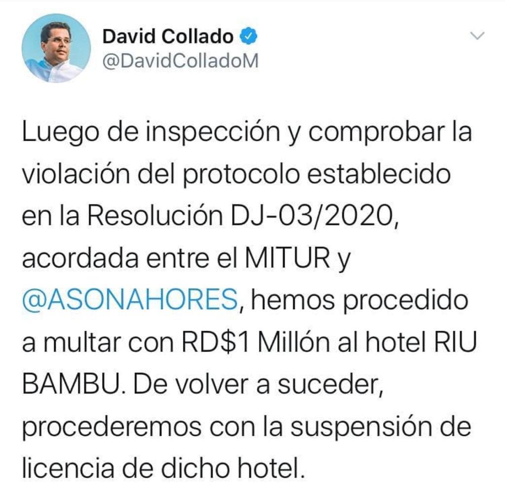 El ministro de Turismo, David Collado, dijo este miércoles que luego de la inspección y comprobar la violación del protocolo establecido, en la Resolución DJ-03/2020, acordada entre el Mitur y Asonahores, han procedido a multar con RD$1,000,000 al hotel Riu Bambú.