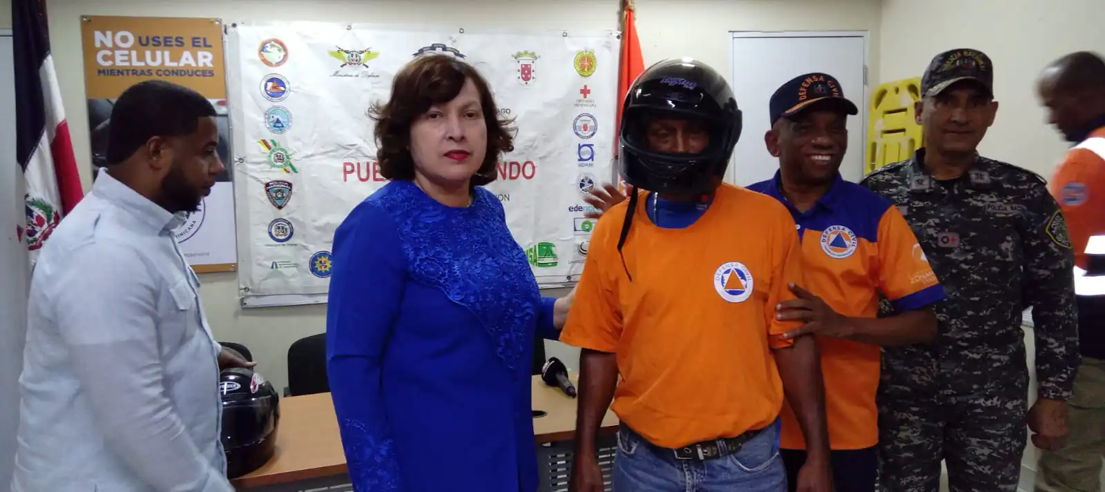 En un operativo preventivo coordinado por el Ministerio del Interior y la Policía, la viceministra Angela Jáquez y el coordinador regional norte de seguridad preventiva, Jonathan Erick, entregaron cascos protectores a los voluntarios de la Defensa Civil que fueron debidamente citados para esta acción.