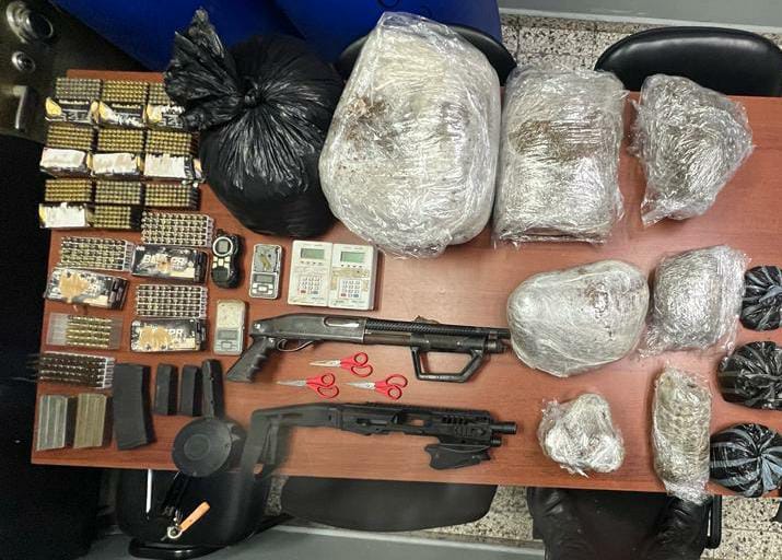 En el allanamiento en que los fiscales e investigadores incautaron 37.3 libras de marihuana, se ocuparon, también, 640 cápsulas para pistolas calibre 9 milímetros, 35 cápsulas 40 milímetros y 48 cápsulas 5.56 milímetros; además, 3 cargadores para fusil, otros 3 cargadores para Glock, uno de ellos Caracol, con capacidad para 50 cápsulas; así también una escopeta calibre 12 y un porta pistola para fusil.