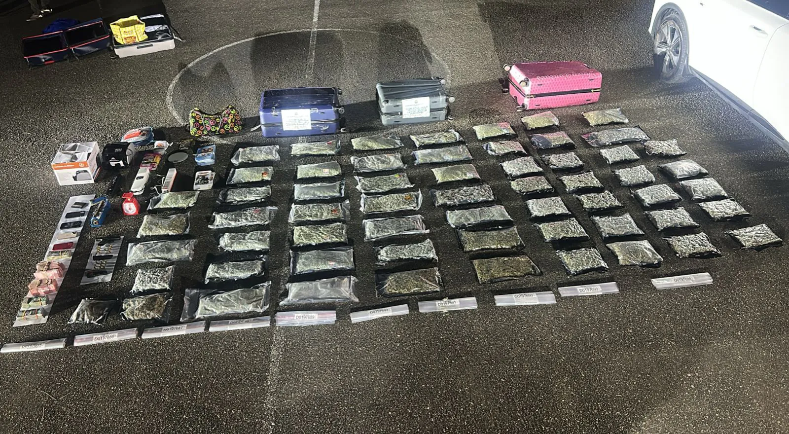 Al ingresar en la vivienda, se encontraron cinco maletas en las habitaciones, dentro de las cuales se hallaron un total de 60 paquetes del vegetal, que se presume es marihuana, todos envueltos en fundas plásticas de color negro, con un peso preliminar de 61.1 libras, equivalente a 29,982 gramos.