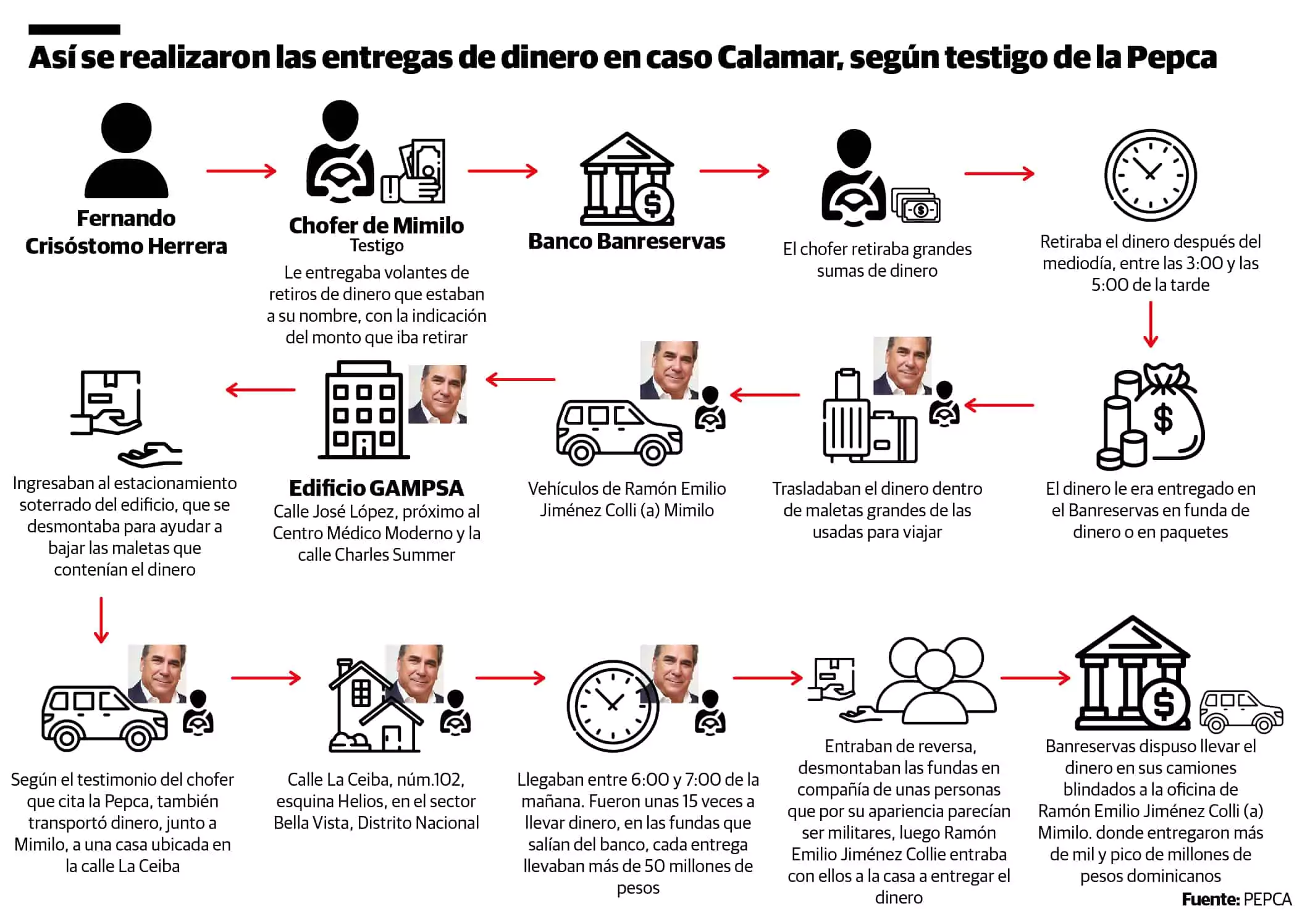 En el documento se narra que “luego de retirar el dinero en el Banco Banreservas lo llevaban a la oficina de Ramón Emilio Jiménez Colli (a) Mimilo, iban “en la nochecita” a llevarlo al edificio GAMPSA, que está ubicado en la calle José López, próximo al Centro Médico Moderno y la calle Charles Summer; que trasladaban el dinero dentro de maletas grandes de las usadas para viajar, en los vehículos de Ramón Emilio Jiménez Colli (a) Mimilo, una Range Rover color azul y una camioneta azul, marca Ford, F-150”.