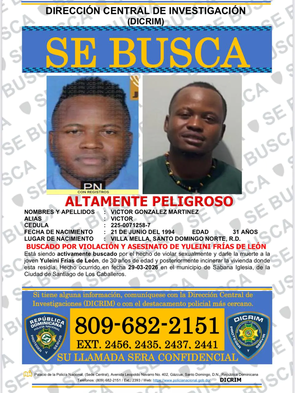 La Policía informó que el imputado es activamente buscado por las autoridades, por lo que exhorta a la ciudadanía a colaborar con cualquier información que permita dar con su paradero, comunicándose con la DICRIM al 809-682-2151