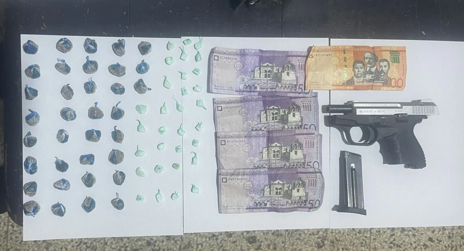 En el lugar fueron ocupadas 35 porciones de un vegetal presumiblemente marihuana, 31 porciones de un material rocoso presumiblemente crack, la suma de RD$300 pesos en efectivo y una pistola marca ZOKAKI, modelo M906-FF, color negro con plateado, sin cápsulas.
