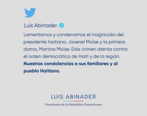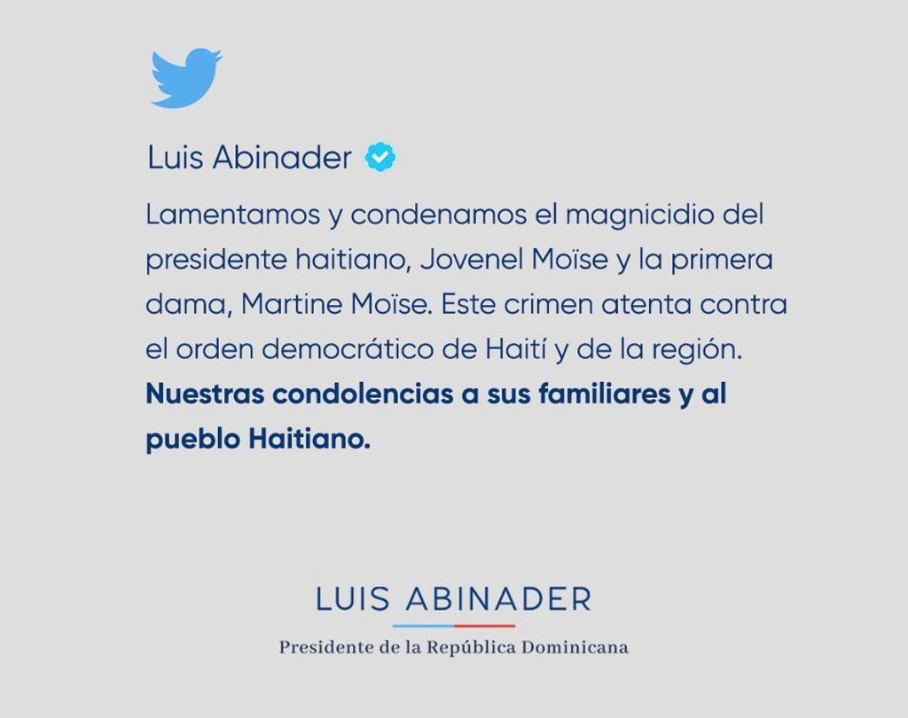 “Lamentamos y condenamos el magnicidio del presidente haitiano, Jovenel Moïse y la primera dama, Martine Moïse. Este crimen atenta contra el orden democrático de Haití y de la región. Nuestras condolencias a sus familiares y al pueblo Haitiano”, escribió el presidente Luis Abinader en su cuenta de Twitter.