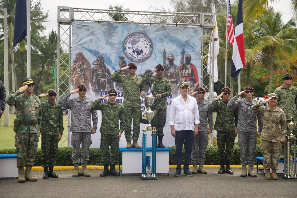 En la actividad, junto al ministro de Defensa teniente general Carlos Luciano Díaz Morfa, ERD, y la titular del Comando Sur del Ejército de los Estados Unidos, general Laura Richardson, el presidente Abinader entregó a la delegación de Colombia la gran copa “Fuerzas Comando 2023” por obtener el primer lugar de la competencia multinacional de operaciones especiales con 1,734 puntos.