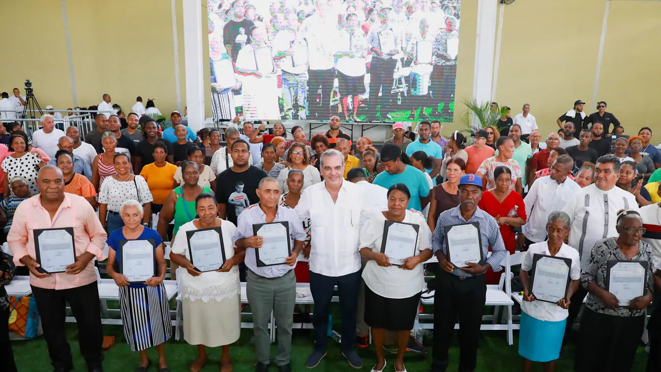 El presidente Luis Abinader concluyó su agenda de trabajo de este sábado con la entrega de 450 títulos de propiedad para beneficiar a 2,404 personas en el distrito municipal Las Clavellinas, en provincia de Azua.