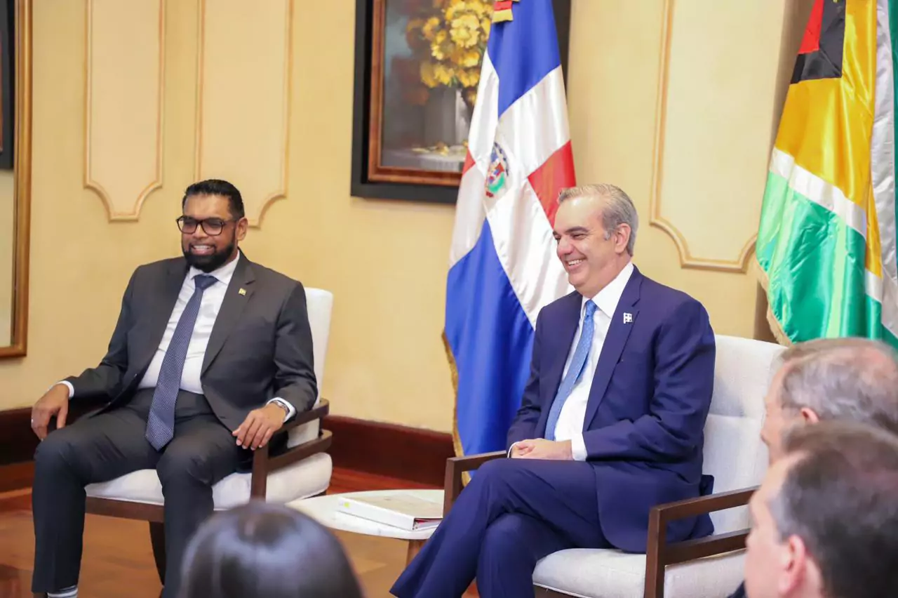 El presidente Luis Abinader recibió este martes en el Palacio Nacional a su homólogo de la República Cooperativa de Guyana, Mohamed Irfaan Alí, quien realiza una visita oficial al país.