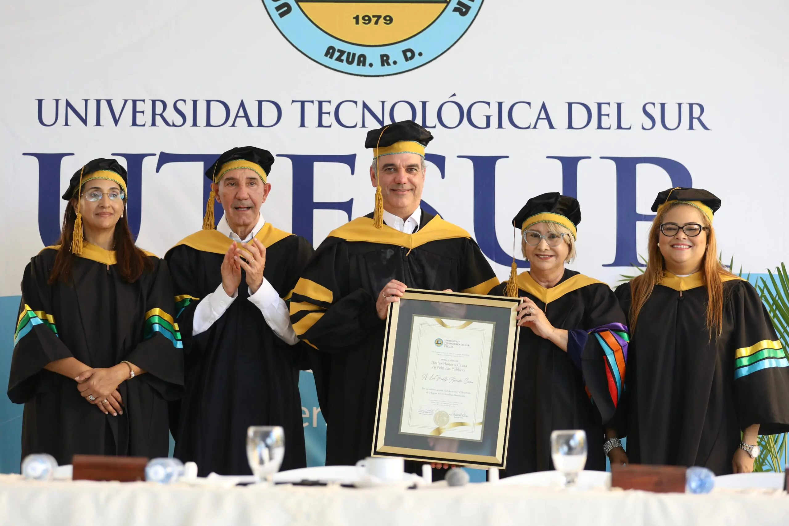El presidente Abinader recibió este viernes el Título Doctor Honoris Causa en Políticas Públicas, la más alta distinción, otorgada por la Universidad Tecnológica del Sur (UTESUR), por haber tomado en cuenta a las instituciones de Educacion Superior en sus Políticas Educativas.