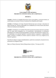 El decreto 741 firmado por Lasso se difundió alrededor de las 07h00 (hora local). El mandatario utilizó el recurso Constitucional, contemplado el artículo 148, conocido popularmente como muerte cruzada. En un mensaje a la nación, Lasso aseguró que “todos los esfuerzos del poder legislativo buscan desestabilizar al gobierno con un juicio infundado”.