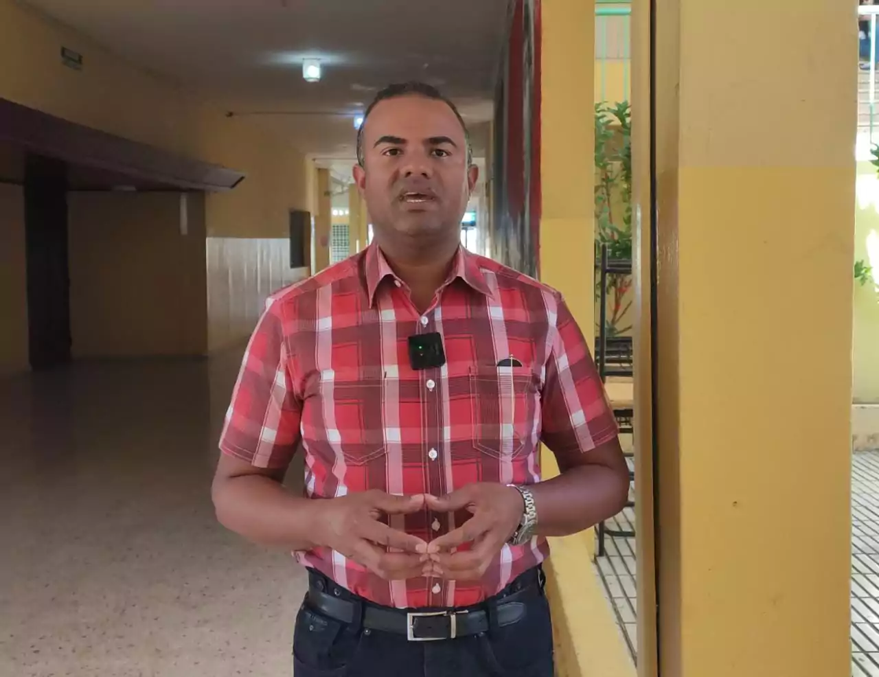 El profesor José Milcíades Peña (Daury), emitió las declaraciones previo al inicio de una asamblea en el salón de actos del Liceo Pedro Henríquez Ureña.
