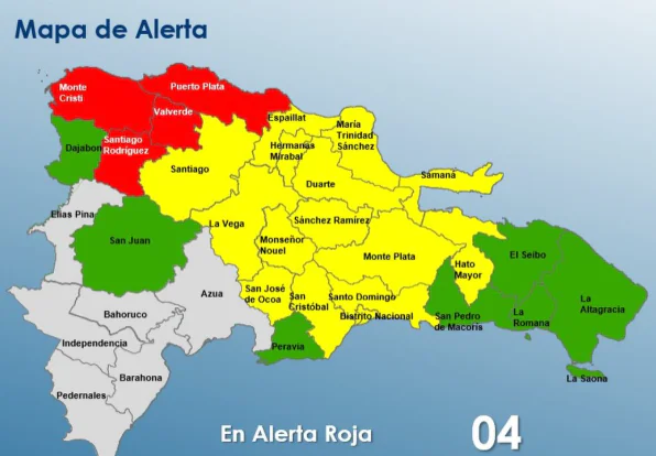 El COE declara alerta roja en Puerto Plata, Montecristi, Valverde y Santiago Rodríguez por inundaciones debido a fuertes lluvias. Otras provincias están en alerta amarilla y verde.