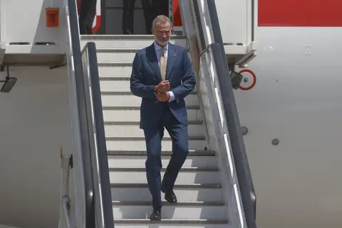 El rey de España, Felipe VI, llegó al Teatro Nacional para la toma de posesión del presidente de la República, Luis Abinader, vestido con un traje de color gris y corbata negra.