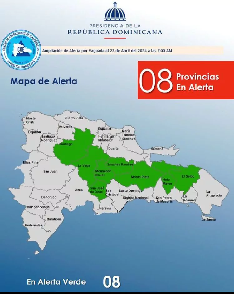 Sánchez Ramírez, Monseñor Nouel, Monte Plata, El Seibo, La Vega, Hato Mayor y San José de Ocoa, junto a Santiago se encuentran en alerta verde, lo cual significa que deben los residentes en esas zonas deben estar atentos ante posibles crecidas de ríos, arroyos y cañadas, inundaciones urbanas, así como posibles deslizamientos de tierra.