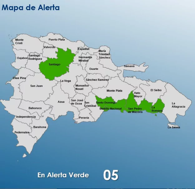 En alerta están la Provincia Santo Domingo, La Romana, Distrito Nacional, Santiago y San Pedro de Macorís.