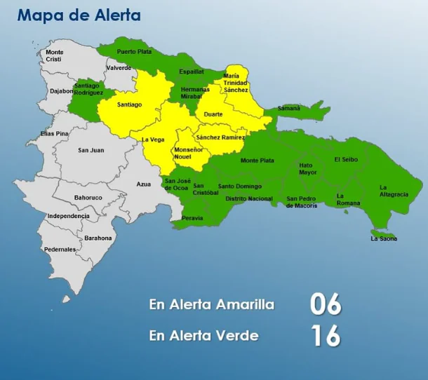 El COE mantiene 06 provincias en alerta amarilla y 15 y el Distrito Nacional en verde, debido a que el INDOMET e INDRHI establecen que el ambiente atmosférico del territorio dominicano seguirá muy propicio para que desde horas matutinas se presenten algunos nublados con chubascos dispersos a moderados en ocasiones y posibles tronadas.