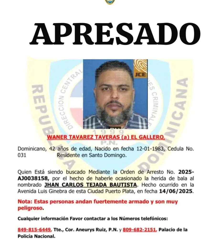 La Policía Nacional informó que fue arrestado, mediante entrega voluntaria, Waner Tavarez Taveras, alias El Gallero, de 42 años, señalado como presunto autor de causar heridas por proyectil de arma de fuego al ciudadano Jhan Carlos Tejada Bautista, de 37 años, en un hecho ocurrido el pasado 14 de junio en la avenida Luis Ginebra, municipio de Puerto Plata.