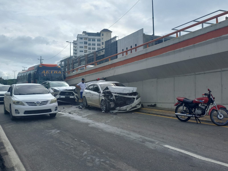 Se registró un accidente múltiple en la avenida Estrella Sadhalá, en Santiago de los Caballeros, en el que un autobús de transporte público impactó con otros seis vehículos tras presuntamente una falla mecánica de los frenos.