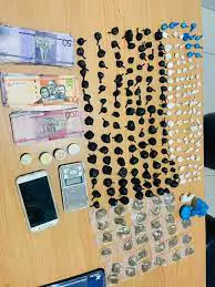 La droga, distribuida en 151 porciones del vegetal verde, 32 porciones del polvo blanco y 32 porciones del material rocoso, estaban dentro un bulto negro, que tenia colgado en el hombro derecho uno de los detenidos, además de una balanza, un celular y la suma de dos mil quinientos cuarenta y cinco pesos en efectivo.
