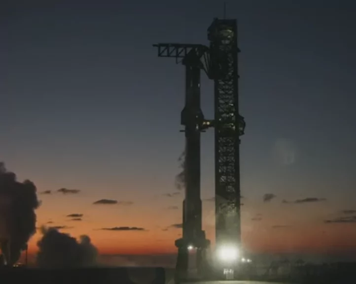Después de haber puesto a la nave en una trayectoria suborbital, el propulsor Super Heavy regresó a la base y fue cazado en el aire por una gran pinza instalada en la torre de lanzamiento. Era la primera vez que se intentaba esa sofisticada maniobra.