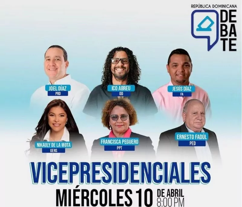 Los aspirantes a vicepresidentes que debatirán en esta entrega del CODESSD son: Nikauly de la Mota, del partido Generación de Servidores; Joel Díaz, del Partido Revolucionario Dominicano (PRD); Ico Abreu, de Opción Democrática; Jesús Díaz, del Frente Amplio; Ernesto Fadul, de Esperanza Democrática y Francisca Peguero, del partido Patria Para Todos.