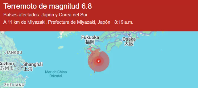 Un terremoto de magnitud 6,9 sacudió este lunes la prefectura de Miyazaki, al sudoeste de Japón, y la Agencia Meteorológica de Japón (JMA) emitió un aviso por la posible llegada de un tsunami de hasta un metro de altura a las costas de la zona.