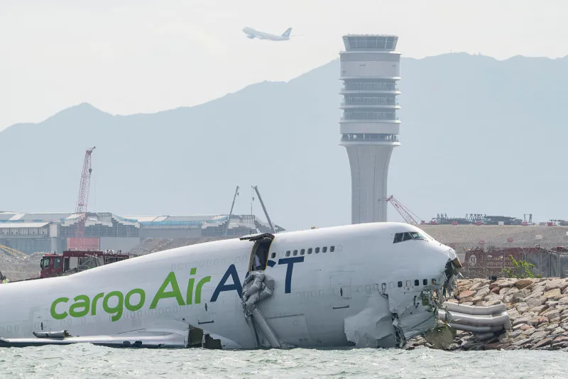 Un avión de carga de Emirates SkyCargo se salió de la pista en el Aeropuerto de Hong Kong, colisionando con un vehículo de servicio y cayendo al mar, causando la muerte de dos operarios de tierra.