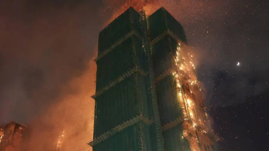 Las llamas se desataron la tarde del miércoles en los tradicionales andamios de bambú que rodeaban los edificios de 31 plantas de la urbanización Wang Fuk Court, en el distrito Tai Po de la zona norte, que se encontraba en obras.