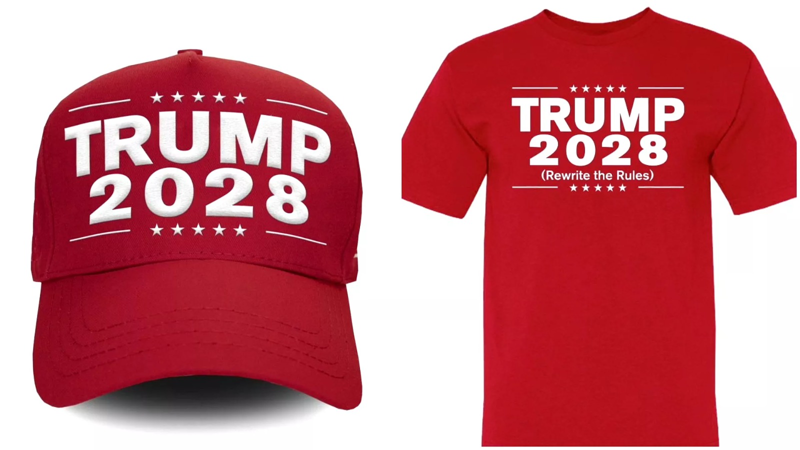 La Organización Trump ha sorprendido al lanzar en su tienda oficial una línea de mercancía con el eslogan “Trump 2028”, a pesar de que la Constitución de Estados Unidos prohíbe taxativamente que un presidente ejerza un tercer mandato. Entre los productos destacan gorras rojas (a USD $50) y camisetas (USD $36) con la inscripción “Trump 2028” en grandes letras blancas​. Por si quedaran dudas sobre el mensaje, las prendas llevan impreso el lema “Reescribe las reglas”, una aparente alusión directa a la norma que impide a un presidente sobrepasar dos mandatos​. Incluso se comercializa un juego de vasos con el mismo motivo​.