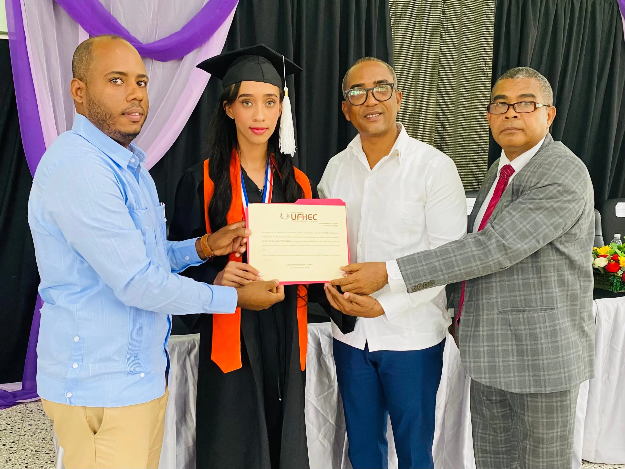 Las beneficiadas fueron las estudiantes Denis de la Cruz Montero y Ana Yris Séptimo Jiménez, quienes alcanzaron los más altos índices académicos de su promoción en las modalidades técnico profesional y Prepara. La entrega fue realizada por el director del Campus UFHEC San Juan – Las Matas de Farfán, Leidy Ogando, quien instó a los graduandos a seguir adelante en su formación profesional.