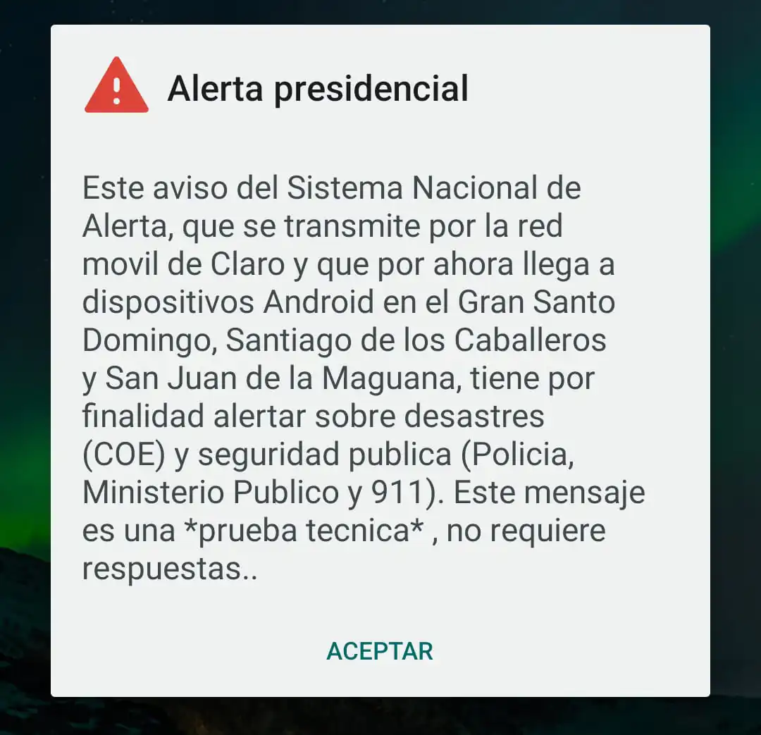 Los usuarios de teléfonos Android conectados a la red de Claro en el Gran Santo Domingo, Santiago de los Caballeros y San Juan de la Maguana recibieron este martes la primera notificación oficial del Sistema Nacional de Alertas, un mecanismo creado para advertir a la población sobre emergencias y desastres a través de las telecomunicaciones.