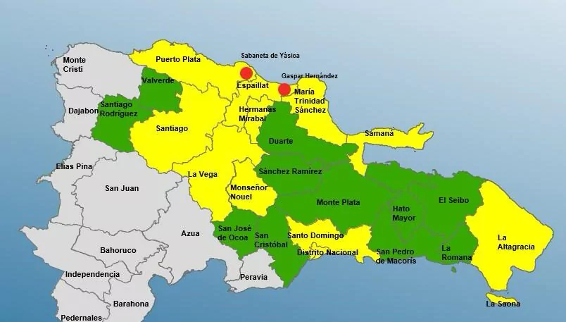Actualmente, 11 provincias están en alerta verde: Sánchez Ramírez, Hato Mayor, San Cristóbal, La Romana, Valverde, San Pedro de Macorís, El Seibo, Monte Plata, Santiago Rodríguez y San José de Ocoa. En alerta amarilla se encuentran Santo Domingo, Hermanas Mirabal, María Trinidad Sánchez y el Distrito Nacional. Mientras que en alerta roja se encuentran el municipio de Gaspar Hernández y el distrito municipal de Sabaneta de Yásica.